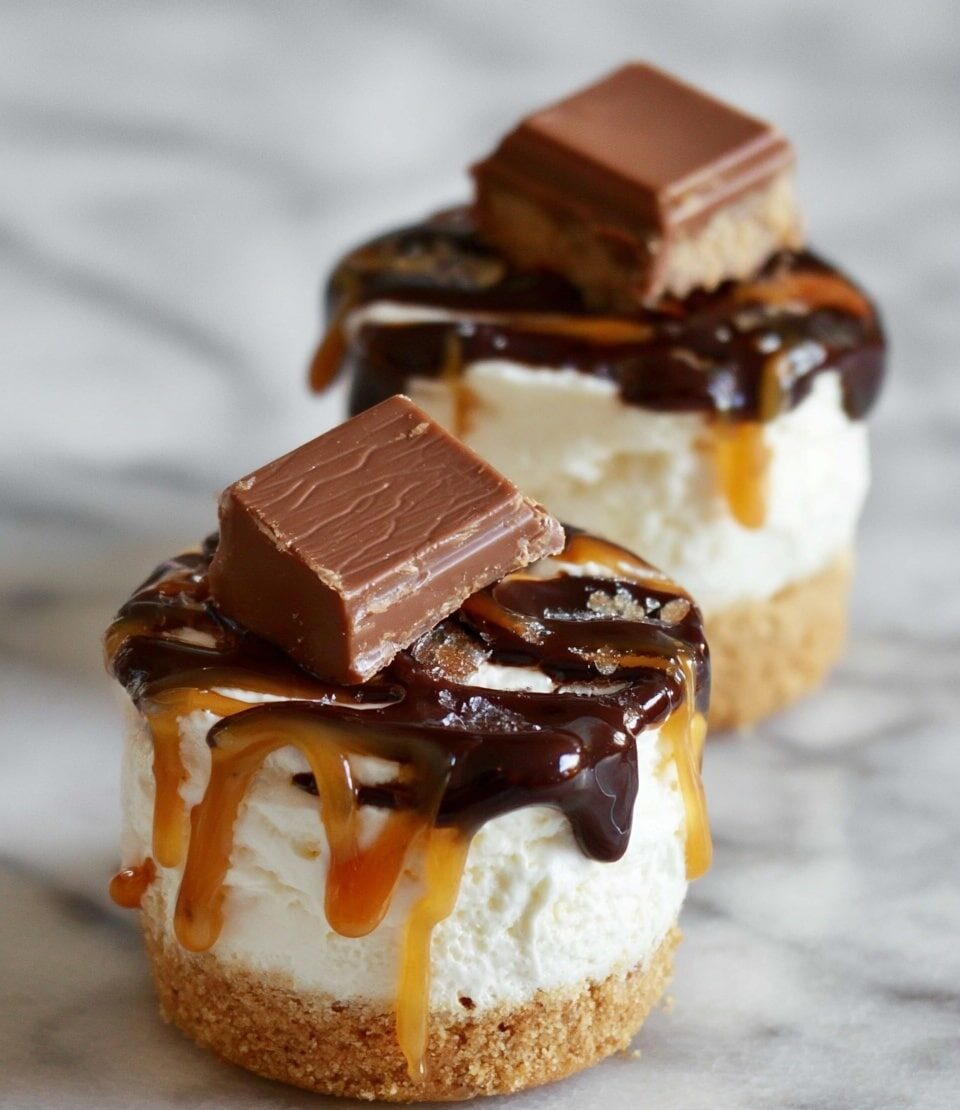 - Step 9: Just before serving, drizzle chocolate and caramel sundae syrup over each cheesecake cup and top with a whole SNICKERS Peanut Butter mini.