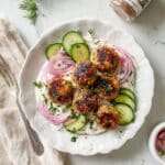 These Moroccan Chicken Meatballs are flavorful, tender, and spiced with a vibrant blend of Ras El Hanout and fresh herbs. Seared to golden perfection and finished in the oven, they are served alongside a fragrant cumin-infused Greek yogurt dip and fresh vegetables for a delicious North African-inspired meal.