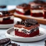 These Oreo Stuffed Red Velvet Brownies combine rich cocoa flavor with the vibrant red color and a delightful surprise of whole Oreos baked inside. Topped with silky chocolate ganache and crushed Oreos, they make an irresistible treat for any occasion.