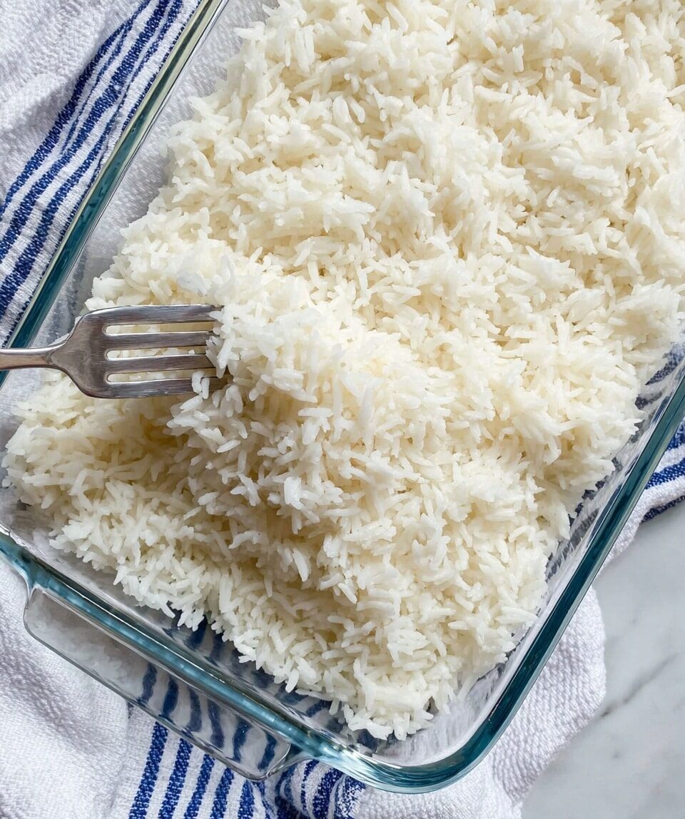 - Rest and Fluff: Remove the baking dish from the oven and let the rice rest, still covered, for 5 minutes. After resting, fluff the rice gently with a fork to separate the grains before serving.