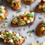 A vibrant and fresh Peach Corn Mozzarella Basil Bruschetta featuring sweet peaches, crisp fresh corn, creamy mozzarella, and fragrant basil served on toasted baguette slices. Perfect as a light appetizer or a summer snack, this bruschetta combines sweet, savory, and tangy flavors with a delightful crunch.