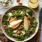 A refreshing and sophisticated Pear Salad featuring juicy ripe pears, toasted walnuts, peppery rocket (arugula), and creamy blue cheese, all brought together with a tangy honey-Dijon vinaigrette. This perfect balance of sweet, savory, and crunchy elements makes an elegant starter or side dish.