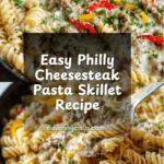 Keywords: Philly cheesesteak pasta, cheesesteak skillet, one-pan pasta, easy dinner, ground beef pasta, provolone cheese recipe, pepper jack cheese pasta