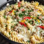 This Philly Cheesesteak Pasta Skillet is a delicious twist on a classic sandwich, combining all the savory flavors with comforting pasta. It’s an easy one-pan meal perfect for busy weeknights and full of melty cheese and tender ground beef.