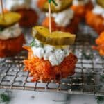 - Assemble and serve: Spear each chicken bite with a toothpick, add a small dollop of the creamy blue cheese sauce and a pickle chip on top. Serve immediately and enjoy these delicious, tangy bites.
