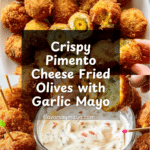 Crispy, golden-fried pimento-stuffed olives filled with creamy pimento cheese, served with a zesty garlic-pimento mayonnaise. This appetizer combines savory, crunchy, and tangy flavors for a delicious bite-sized treat perfect for parties or snacks.