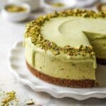 Keywords: pistachio cheesecake, pistachio paste, graham cracker crust, white chocolate ganache, baked cheesecake