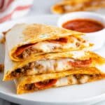 - Serve: Remove the quesadilla from the pan and slice into wedges. Serve warm with extra pizza sauce for dipping.