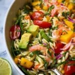 Keywords: prawn salad, mango salad, avocado salad, summer salad, lime dressing, healthy salad, seafood salad, risoni salad