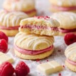 These Raspberry Cream Sandwich Cookies are delicate, buttery cookies filled with a smooth white chocolate and freeze-dried raspberry cream. The cookies are lightly crisp on the edges with a soft center, perfectly complemented by a tart and creamy raspberry filling. Finished with a drizzle of white chocolate and crushed raspberries, these elegant treats are ideal for special occasions or a refined everyday dessert.