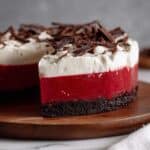 A luscious Red Velvet Cheesecake featuring a crunchy Oreo cookie crust, rich red velvet cream cheese filling, and topped with lightly whipped cream and shaved dark chocolate. This no-bake dessert combines the classic flavors of red velvet with a creamy cheesecake texture, making it perfect for festive occasions or elegant dessert tables.