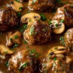 Classic Salisbury steak meatballs served in a rich mushroom gravy, perfect over creamy mashed potatoes, rice, or pasta. These flavorful meatballs combine ground beef with savory spices, panko, and onion, cooked in a skillet with sautéed mushrooms and a thickened beef gravy.