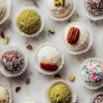 - Decorate and Garnish: Prepare two small bowls: one with extra unsweetened shredded coconut and/or finely chopped toasted pecans or pistachios, and the other with sprinkles. Working with one ladoo at a time, dampen your hands slightly to help the garnishes stick. Roll each ladoo in the shredded coconut or nut mixture, and press the top of some ladoos into the sprinkles. The ladoos will flatten slightly in this process; gently reshape them into balls if needed. Place the finished ladoos in small paper cups or arrange them on a serving platter as you go.