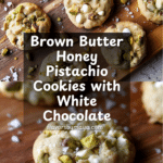 Keywords: salted honey pistachio cookies, white chocolate chip cookies, browned butter cookies, nutty cookies, homemade cookies, dessert recipe, baking cookies