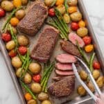 Keywords: sheet pan steak, broiled steak, one pan dinner, quick steak recipe, asparagus recipe, roasted potatoes, cherry tomatoes