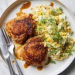 This Smashed Chicken with Corn and Cabbage recipe features crispy skin-on chicken thighs cooked in a cast-iron skillet and served with a tangy cabbage salad mixed with corn, Greek yogurt, and pickles. A spicy sauce made from pan drippings adds a flavorful kick to this easy, one-pan dish perfect for a satisfying weeknight dinner.