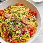 Store the spaghetti salad in an airtight container in the refrigerator for up to 3 days. Stir gently before serving again. It’s best enjoyed cold, but you can let it sit at room temperature for 10–15 minutes for softer flavors.