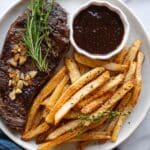 Store leftover steak and fries separately in airtight containers in the refrigerator for up to 3 days. Reheat steak gently in a skillet or oven to avoid overcooking. Reheat fries in an oven or air fryer to help restore their crispness.