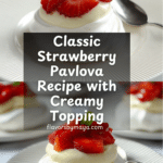 This classic Strawberry Pavlova features a crisp meringue shell with a soft, marshmallow-like interior, topped with a smooth cream cheese filling and fresh strawberries. Perfectly sweet and airy, this dessert balances light textures and fruity freshness for an elegant treat.
