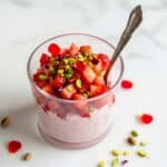 A refreshing and elegant Strawberry Rose Chia Pudding made with creamy Greek yogurt, nutrient-rich chia seeds, and fresh strawberry puree, delicately flavored with rose water and naturally sweetened with maple syrup. Perfect for a healthy breakfast, snack, or dessert, topped with chopped pistachios, dried rose petals, and pumpkin seeds for added crunch and flavor.