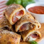 Keywords: pizza bread, Italian sausage pizza roll, baked pizza roll, mozzarella, pepperoni, easy pizza recipe, appetizer, snack