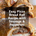 A delicious and easy-to-make Pizza Bread roll packed with mozzarella cheese, Italian sausage, and pepperoni, baked to golden perfection and perfect for serving with pizza sauce as a flavorful appetizer or snack.