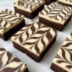 - Apply Tahini Swirl: Pipe horizontal lines closely together across the brownie batter, then use a knife or toothpick to drag up and down, creating a feathered swirl pattern. Alternatively, you may swirl the tahini on top as desired.