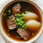 Tasty Korean Winter Soup is a comforting and hearty broth made by simmering beef short ribs with aromatic ingredients such as yellow onion, ginger, garlic, and Korean leeks or green onions. Enhanced with radish and seasoned simply with soy sauce and salt, this traditional soup offers a rich, clear broth perfect for cold weather meals, accompanied best by a bowl of rice.