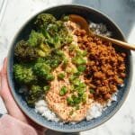 These Teriyaki Tofu Bowls with Kimchi Mayo offer a deliciously crispy shredded tofu glazed in savory teriyaki sauce, paired with vibrant steamed broccoli and jasmine rice. The dish is finished with a tangy, spicy kimchi mayo, making it a flavorful and satisfying vegan bowl perfect for any meal.