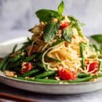 Authentic Thai Green Papaya Salad, or Som Tum, is a vibrant, zesty dish featuring shredded green papaya, crunchy snake beans, cherry tomatoes, and a spicy, tangy dressing made from garlic, bird eye chillies, dried shrimp, palm sugar, lime juice, and fish sauce. This refreshing salad is garnished with roasted peanuts and Thai basil leaves, delivering a perfect harmony of sweet, sour, salty, and spicy flavors in every bite.