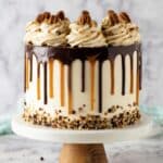 Keywords: Chocolate cake, caramel sauce, buttercream frosting, turtle cake, layered cake, chocolate ganache, toasted pecans