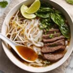 - Serve: Divide the cooked noodles into serving bowls, ladle the hot beef broth and tender beef slices over the noodles, and garnish with lime wedges, sriracha, and fresh bean sprouts to taste.