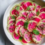 This Watermelon Radish Salad is a vibrant, refreshing dish featuring thinly sliced watermelon radishes dressed in a tangy, slightly sweet miso vinaigrette. Enhanced with fresh ginger, scallions, and mint, and topped with sesame seeds, this salad is perfect as a light appetizer or side dish, combining crisp textures and bright flavors.