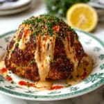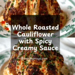 This Whole Roasted Cauliflower with a Creamy Sauce is a flavorful and visually stunning vegetarian dish that features a whole cauliflower head boiled, then roasted with a smoky, spiced butter and olive oil mixture. It’s served with a tangy and creamy tahini-miso sauce, topped with sesame seeds, chives, and salsa macha for an added kick. Perfect as a centerpiece for dinner or a healthy side dish.