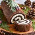 A classic French Yule Log Cake (Bûche de Noël), featuring a light chocolate sponge rolled with creamy mascarpone filling, covered in a rich whipped chocolate ganache, and decorated to resemble a festive log. Perfect for holiday celebrations, this cake balances a tender crumb with luscious frosting and elegant garnishes.